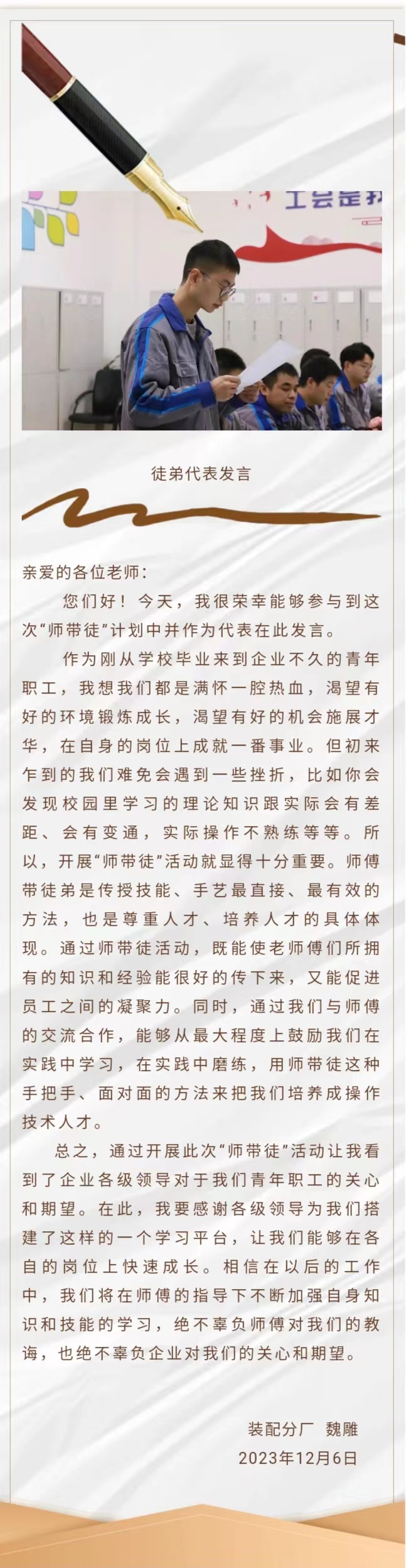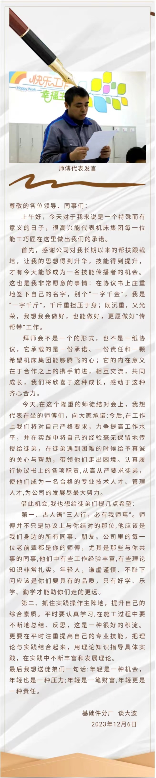 为进一步开发人力资源,充分挖掘技师团队的“传、帮、带”提高青年技术工人的技能素质,培养和造就一支掌握精湛技艺、弘扬工匠精神的技能人才队伍,12月6日,世界杯开户买球(中国)集团有限公司集团“名师带徒”签订仪式在装配分厂职工小家隆重举行。